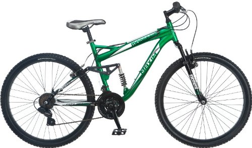 The Maxim 26" is designed for peak performance under rugged conditions, 21 speed Mongoose Maxim will tackle all your off-road and in-city journeys with ease. It offers an alloy frame with a full (or dual) suspension, which adds a heavy duty shock absorber to the back wheel in addition to the front fork suspension. This full suspension provides more comfort and greater control as you attack the trails. It has 21-speed shifting with a Shimano rear derailleur and SRAM MRX shifting. Other features include a comfortable ATB anatomical saddle, lightweight alloy rims with MTB hubs, alloy linear pull brakes, black MTB wheels, three-piece crank, and an MTB handlebar and stem.Designed for peak performance under rugged conditions, the Mongoose Maxim 26-inch men's mountain bike will tackle all your off-road and in-city journeys with ease. The Maxim is outfitted with a lightweight alloy front triangle frame and a dual-suspension system, which includes a heavy-duty shock absorber over the back wheel that teams up with the front fork suspension to add comfort and control as you attack the trails. The Maxim also shifts smoothly thanks to the Shimano rear derailleur and 21-speed SRAM MRX twist shifters. Other details include a comfortable ATB saddle, lightweight alloy rims with MTB hubs, alloy linear pull brakes, black 26-inch MTB wheels, a three-piece crank set, and an MTB handlebar and stem.