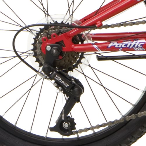 Steel frame and suspension fork.MTB handlebar and stem.6-speed index torque drive twist shifter.Front and read Linear pull brakes. 1-piece crank.Steel wheels with 1.95" tires.Give your little guy the gift that will get him moving--the Pacific Evolution Boy's Mountain Bike! The Evolution is the ultimate powerhouse in boy's mountain bikes, and it's sure to light up your child's face when he glimpses the Vortex Suspension Fork, the Torque Drive twist shifters, rugged tires, and that ultra-cool and rugged steel frame. In no time flat he'll be conquering mountains with his new Evolution, and the assembly it took to get him there will build his confidence in mechanical skills and thinking. Give him the ride of his life with the Pacific Evolution.